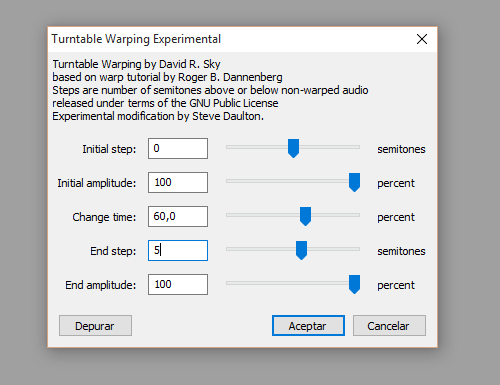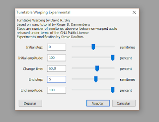 Selecciona el sonido completo, busca en la barra de Menú Efecto / Turntable Warp y ajusta los valores del cuadro resultante, por ejemplo, de la siguiente forma: