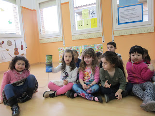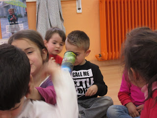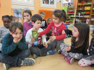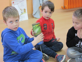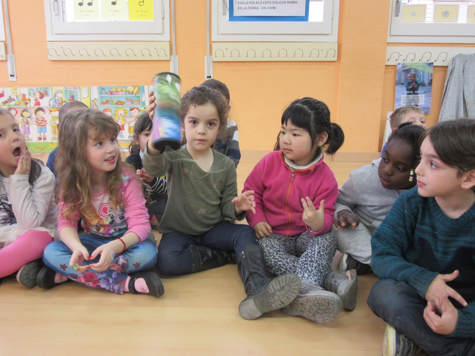 El dimecres van caure quatre gotes, així que vem aprofitar per cantar cançons de pluja i perquè no! Fer ploure dins de l'aula! Va ser molt divertit