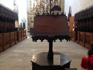 El FACISTOL era un atril grande que se colocaba en medio del coro para apoyar el libro de cantos (de gran tamaño porque no había fotocopiadoras, así que hacían dos o tres libros grandes para todos). Los facistoles más antiguos que se conocen son del siglo XV (algunos presentaban como decoración un águila sobre la que solían colocar el libro). Fue en el Renacimiento cuando comienzan a usarse los facistoles dobles o giratorios (como el que hemos visto en la Cartuja), incluso cuádruples (con cuatro caras para poner cuatro libros). Y ya que estamos hablando de libros de cantos, también en Burgos (pero en el Monasterio de las Huelgas) tenemos uno de los más antiguos e importantes: el códice (o codex) de las Huelgas.