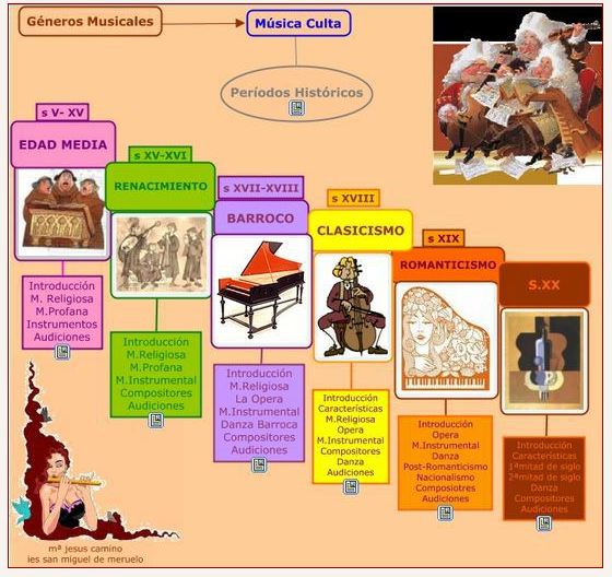 En aquest curs estudiarem els períodes de la "Història de la Música"Abans d'entrar en matèria vull que feu una ullada a aquest mapa conceptual creat per la Mª Jesús Camino que us ajudarà a aprendre la cronologia de les grans èpoques musicals. Clica a sobre de la imatge. Escriu en el teu dossier aquest mapa conceptual ordenat cronològicament.