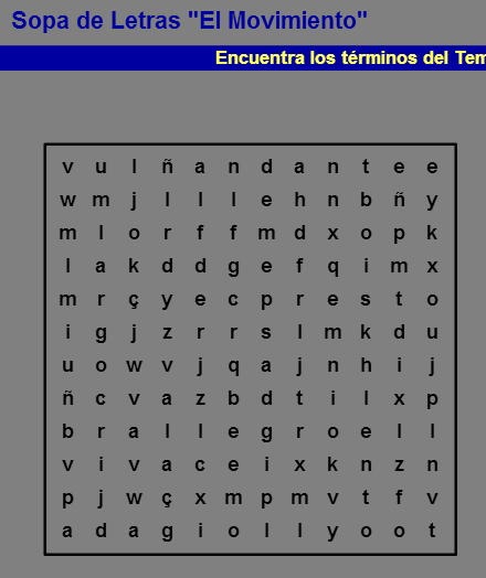 Fes ara aquesta sopa de lletres i busca totes les paraules relacionades amb el moviment. Recorda que són paraules italianes.