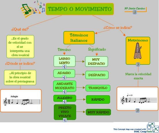 Acabem de treballar el moviment de la música, la velocitat, que com ja sabeu s'anomena TEMPO. L'aparell que mesura aquesta velocitat es diu METRÒNOM. I les paraules que apareixen en la partitura són les INDICACIONS DE MOVIMENT. Us deixo aquest mapa conceptual fets amb Cmap Tools per la  Mª Jesús Camino. Estudeiu bé els conceptes perquè haureu de fer vosaltres un mapa conceptual amb una altra eina que us ensenyaré el proper dia de classe.